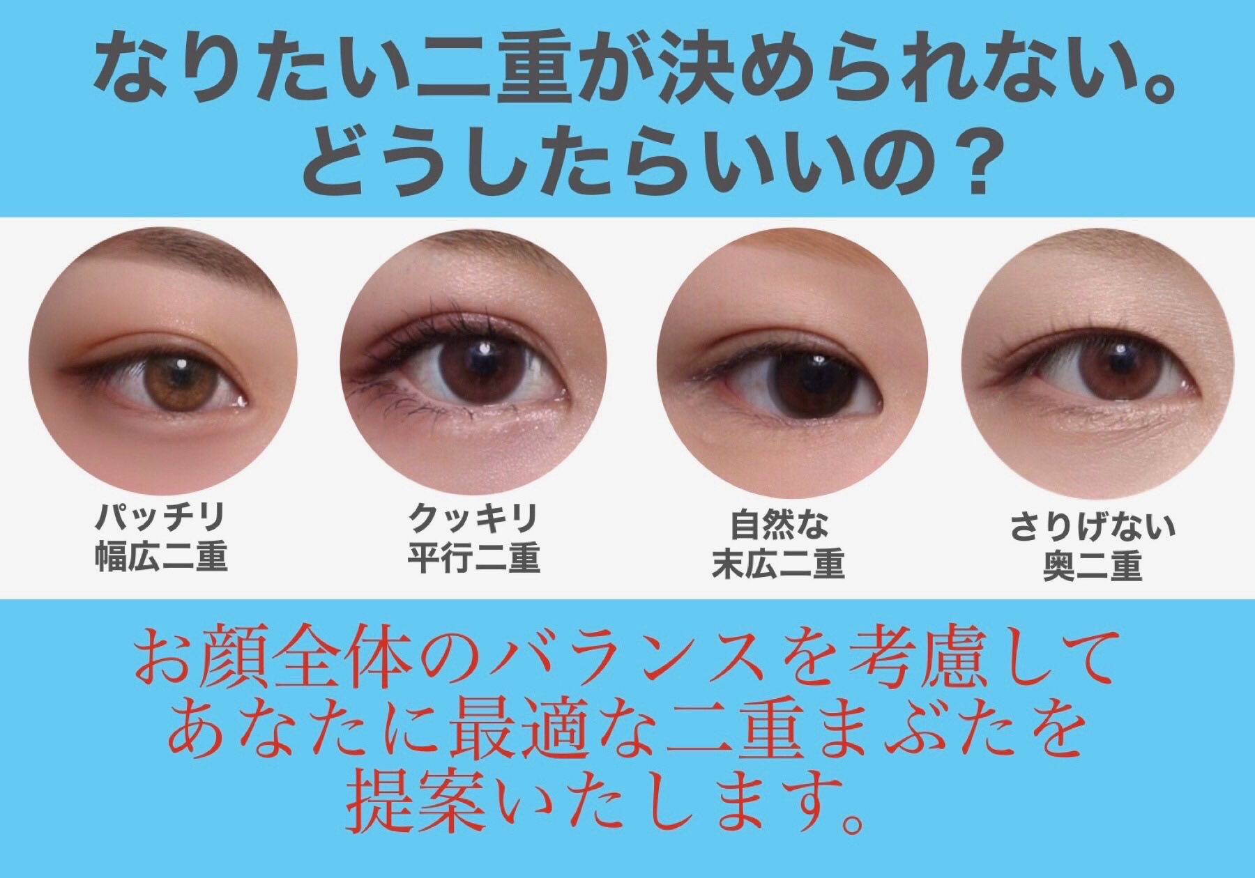 セントローズクリニック 美容外科 美容皮膚科 二重まぶたにはなりたいけど 私には似合う二重ってどれなの お顔全体のバランスを考慮し ベストな二重まぶたをご提案いたします 二重 二重治療 自分に合った二重 切開 パッチリ二重 理想の二重